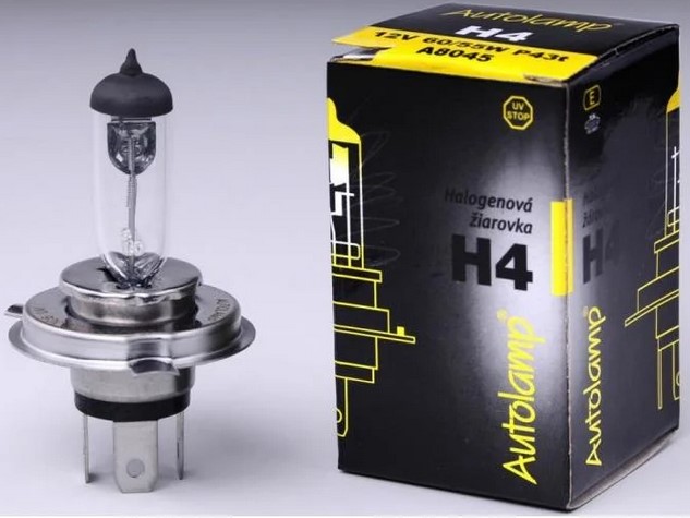 Halogenová autožárovka Autolamp, přináší ideální světelnou účinnost, výbornou odolnost a spolehlivost, typ H4, patice P43t, vhodné především pro přední světla, napětí 12 V, výkon 55 W.