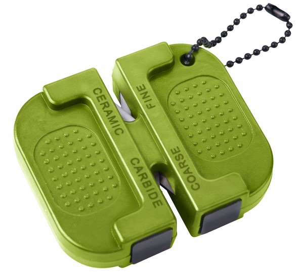 Malý brousek na nože s řetízkem k broušení "nahrubo" pomocí dvojice karbidových plátků a jemnému finálnímu naostření pomocí keramických plátků.