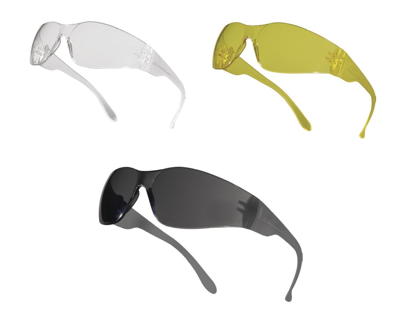 Jednočočkové polykarbonátové brýle. Rozšířené konce stranice. Integrovaný polykarbonátový nosní můstek. Snadné použití s ochrannou přilbou a chrániči sluchu. Postranní ochrana.