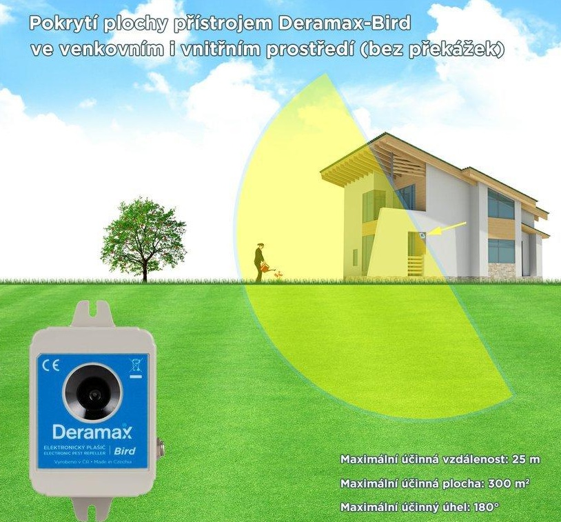 Přístroj Deramax-Bird je určen k využití jako plašič (odpuzovač) ptáků.