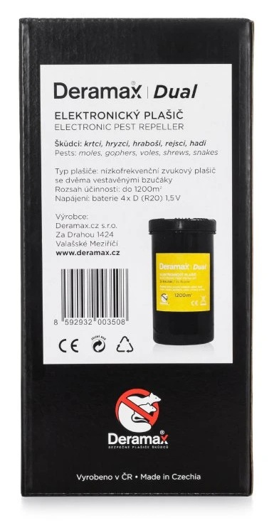 Díky stupni krytí IP67 je možné úplné uložení plašiče do půdy, aniž by došlo k jeho poškození vlhkostí, nebo stojatou vodou. Plašič Deramax-Dual vydrží i ty největší mrazy, horka a přívalové deště. Uložení plašiče pod vrstvu půdy cca 10 cm chrání napájecí baterie proti nadměrnému přehřívání v létě, a naopak nízkým teplotám v zimním období. Velmi kvalitní a odolný obal plašiče z certifikovaného polyethylenu bez problémů zvládne velmi vysoké i velmi nízké teploty, aniž by došlo k jeho degradaci. Kvalitní použité součástky a materiály zajišťují předpokládanou životnost plašiče 20 let.