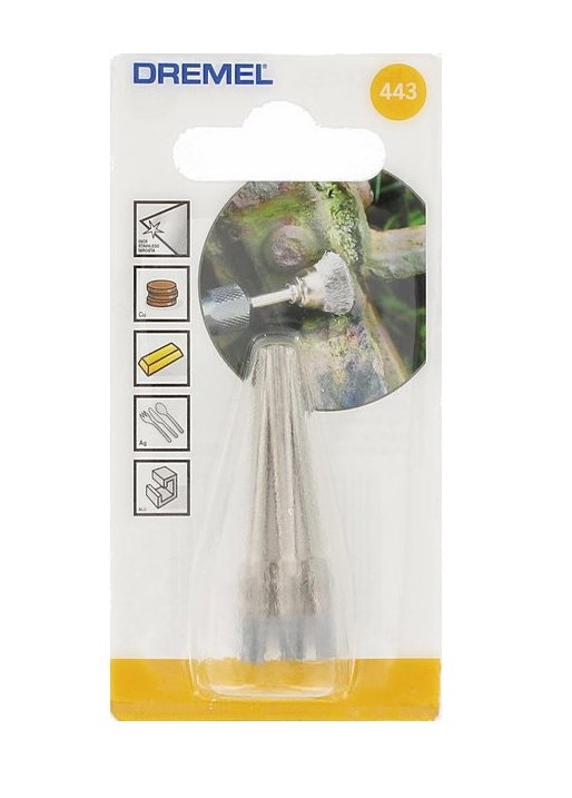 Univerzální kartáčky DREMEL 443 na odstraňování rezu, leštění kovových povrchů, odjehlování a zahlazování přechodů na spojovaných místech, nebo na čištění elektrických součástek.