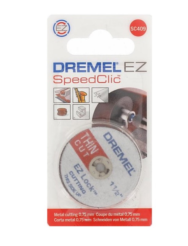 DREMEL SC409 jsou sklolaminátem vyztužené řezné kotouče, které jsou jen 0,75 mm tlusté. Hodí se na přesné řezání v jakémkoliv kovu. Patentované rychloupínání EZ SpeedClic navíc umožňuje rychlou a snadnou výměnu příslušenství, bez použití dalších nástrojů.