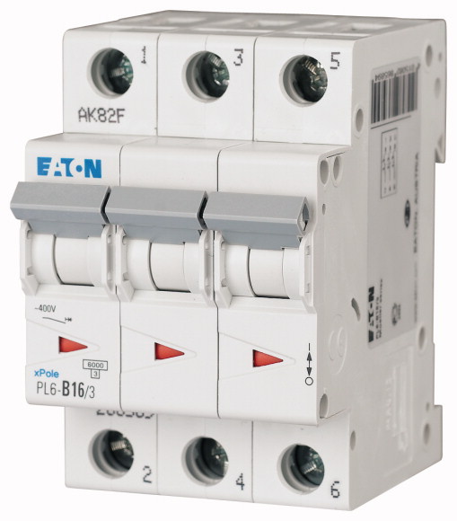 Jističe vedení PL6, 3-pólové, Tripping Characteristic: B, Rated current In: 16 A, Rated switching capacity (IEC/EN 60947-2): 6 kA. Spínací přístroje pro bytovou výstavbu a účelové stavby.