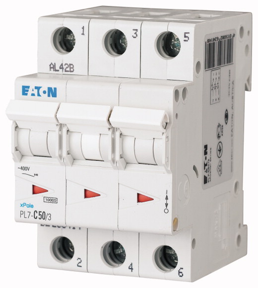 Spínací přístroje pro bytovou výstavbu a účelové stavby. Parametry Značka: Eaton Vypínací charakteristika: B Počet pólů (celkem): 3 Počet jištěných pólů: 3 Dimenzovaný proud: 50 A Dimenzované napětí: 400 V Jmenovitá vypínací schopnost zkratu Icn EN 60898 při 230 V: 10 kA Jmenovitá vypínací schopnost zkratu Icn EN 60898 at 400 V: 10 kA