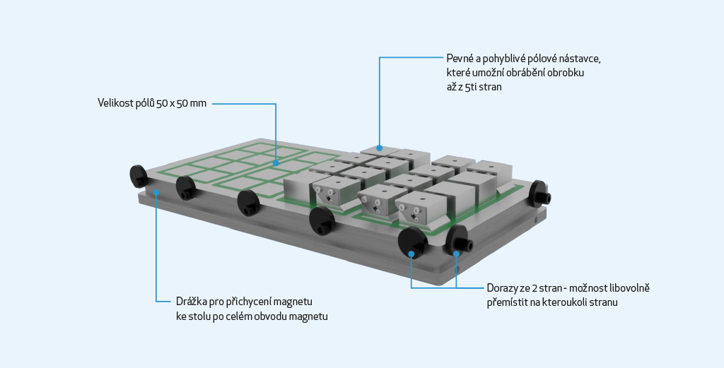 Hledáte-li všestranný magnetický upínač vhodný pro frézování a vrtání malých, ale i velkých obrobků, pak je Mastermill dobrou volbou. Pomocí pólových nástavců je navíc možné materiál obrábět až z 5 stran, vrtat skrz a obrábět i nerovný materiál. Pro dosažení optimální upínací síly je nutná tloušťka obrobku min. 12 mm.