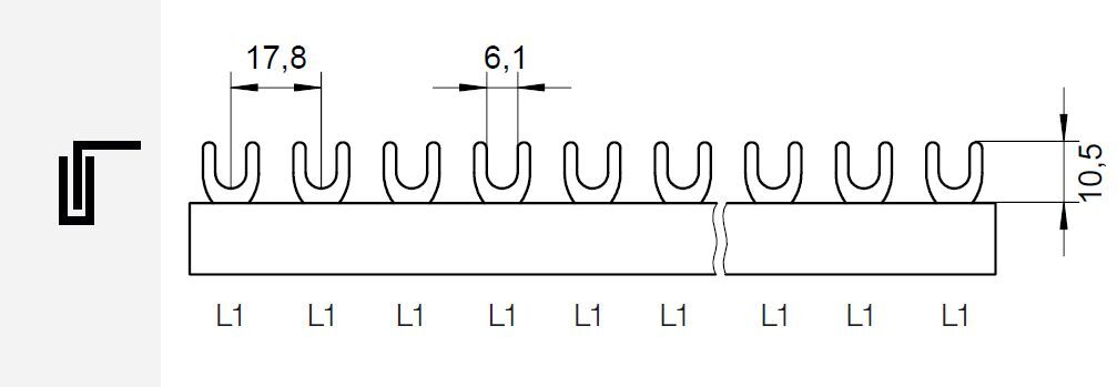 Prop. lišta G-1L-210/12 ISO, vidlička, 1pól., 65A, rozteč 17,8mm, 12mm2, 210mm, přip. míst = 12, pro šroub M5-M6, koncovka EK-C-1/10-16 Propojovací fázové lišty umožňují propojení modulových přístrojů (např. jističů, chráničů, modulových vypínačů apod.) jednoduchým a profesionálním způsobem. Standardní délky lišt jsou 210 mm (propojení 12ti modulů) nebo 1 metr. Tyto standardní rozměry lze libovolně krátit (konce lišt doporučujeme osadit plastovými koncovkami). Ve srovnání s klasickou instalací pomocí kabelových mostů nabízí propojovací lišty následující výhody: • spolehlivé přiřazení fází • zpřehlednění rozváděče • rychlejší instalace - úspora času • kompaktní rozměry