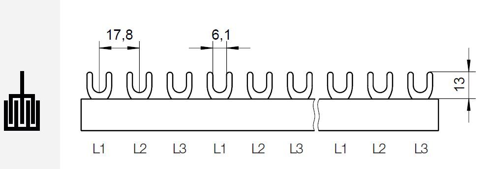 Prop. lišta G-3L-210/10C SO, vidlička, 3pól., 63A, rozteč 17,8mm, 10mm2, 210mm, přip. míst = 12, pro šroub M5-M6, koncovka EK-C-3/10 Propojovací fázové lišty umožňují propojení modulových přístrojů (např. jističů, chráničů, modulových vypínačů apod.) jednoduchým a profesionálním způsobem. Standardní délky lišt jsou 210 mm (propojení 12ti modulů) nebo 1 metr. Tyto standardní rozměry lze libovolně krátit (konce lišt doporučujeme osadit plastovými koncovkami). Ve srovnání s klasickou instalací pomocí kabelových mostů nabízí propojovací lišty následující výhody: • spolehlivé přiřazení fází • zpřehlednění rozváděče • rychlejší instalace - úspora času • kompaktní rozměry
