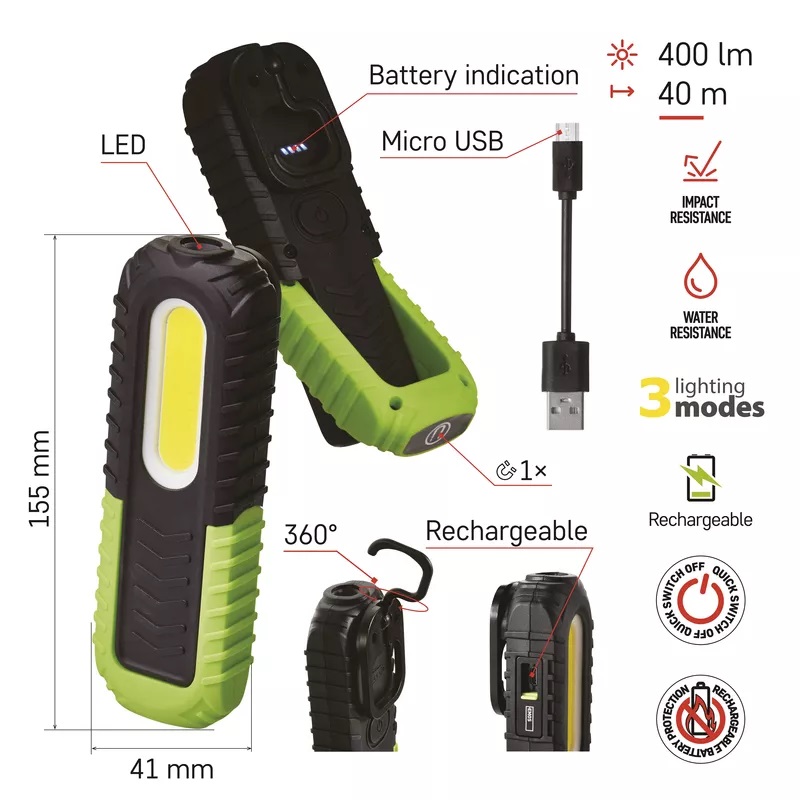 Světelný tok: COB LED 100 % – 400 lm, COB LED 50 % – 120 lm, LED 100 % – 120 lm; režimy svícení: COB LED 100 %, COB LED 50 %, LED 100 %; doba svícení: 3–8,5 h; doba svícení detail: COB LED 100 % – 3 h, COB LED 50 % – 8,5 h, LED 100 % – 7,5 h; maximální dosvit: 40 m; nárazuvzdornost: ano; voděodolnost: ano; napájení: Li-Ion akupack; typ baterie: 2 000 mAh/3,7 V