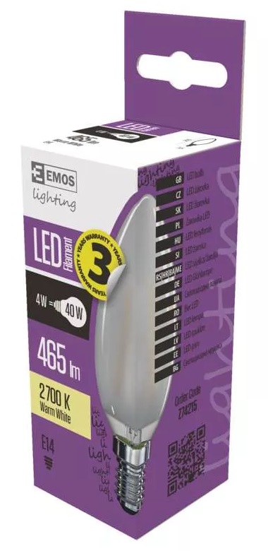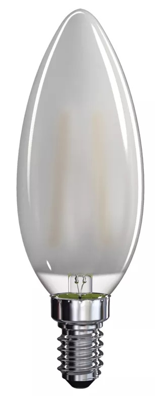 Patice (uchycení žárovky): E14 barva světla: teplá bílá náhrada za žárovku: 40 W stmívatelná: ne tvar: Candle světelný tok/svítivost: 465 lm příkon: 4 W kategorie/řada: FILAMENT technologie: LED teplota chromatičnosti: 2 700 K světelná účinnost: 116 lm/W energetická třída: A++ úhel vyzařování: 360° životnost: 25 000 hodin záruční doba: 3 roky účiník: 0,5