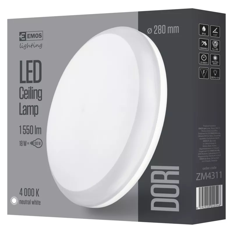 Svítidlo můžete mít ve variantě s neutrální bílou barvou světla (4000 K), která má nejblíže k přirozenému dennímu světlu. Výhodou oblíbeného svítidla Dori je také vysoký stupeň krytí. Svítidlo je tak vhodné do všech prostor s vysokou vlhkostí. Přisazené svítidlo Dori má klasický kruhový tvar a uvnitř ukrývá moderní, velmi úsporné a trvanlivé LED diody s vysokou světelnou účinností. Životnost svítidla je predikována na 25 000 hodin. Během nich vám bude krycí mléčný difuzor posílat světlo rovnoměrně a příjemně v širokém úhlu 115°.