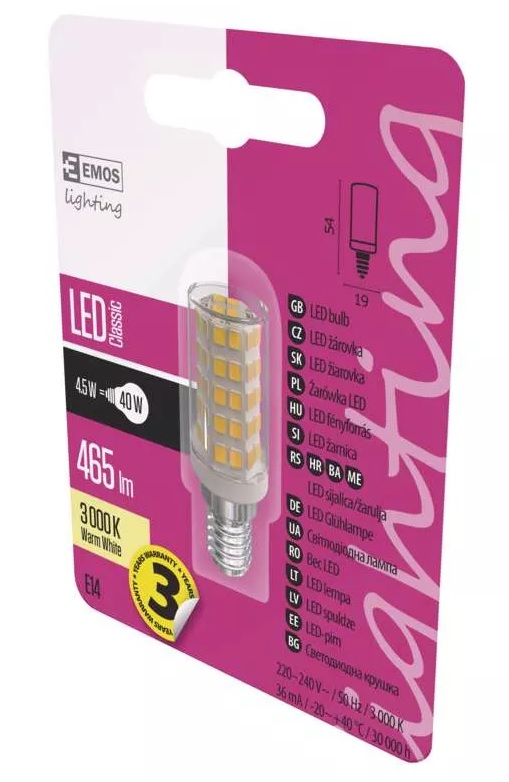 Patice (uchycení žárovky): E14 barva světla: teplá bílá náhrada za žárovku: 40 W stmívatelná: ne tvar: JC světelný tok/svítivost: 465 lm příkon: 4,5 W kategorie/řada: CLASSIC technologie: LED teplota chromatičnosti: 3 000 K světelná účinnost: 103 lm/W energetická třída: A++ úhel vyzařování: 300° životnost: 30 000 hodin záruční doba: 3 roky účiník: 0,5
