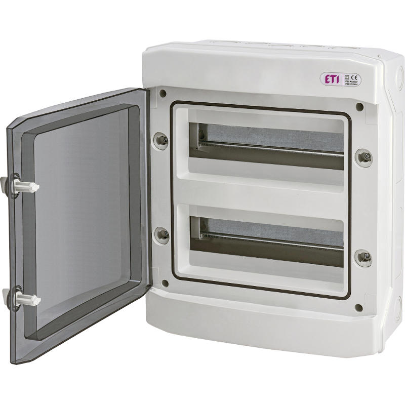 Rozvodnice plastová, montáž na omítku, IP65, 2Ř, 2x12M, ETI Plastová rozvodnice pro domovní elektroinstalace s průhlednými dvířky. Díky vysokému krytí je vhodná i pro venkovní použití.