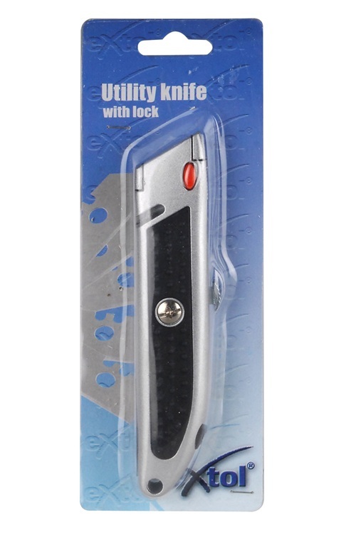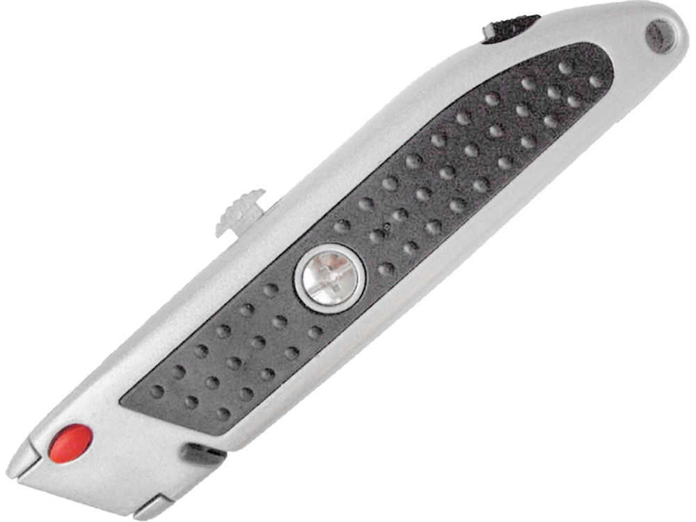 Nůž s výměnným trapézovým břitem, hliníkovou rukojetí a praktickým zásobníkem na náhradní břity přímo v těle nástroje.