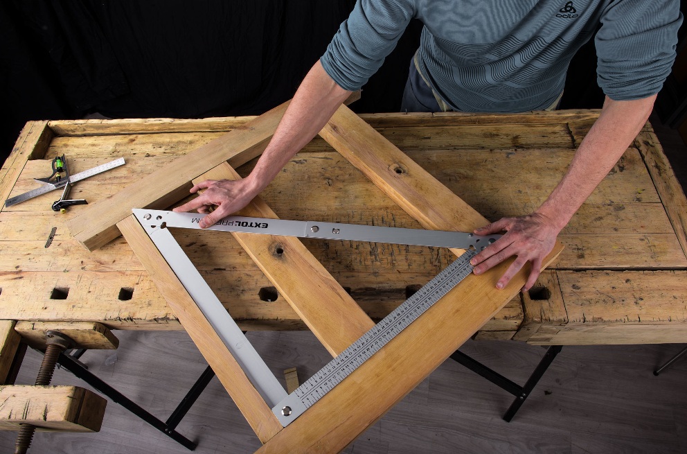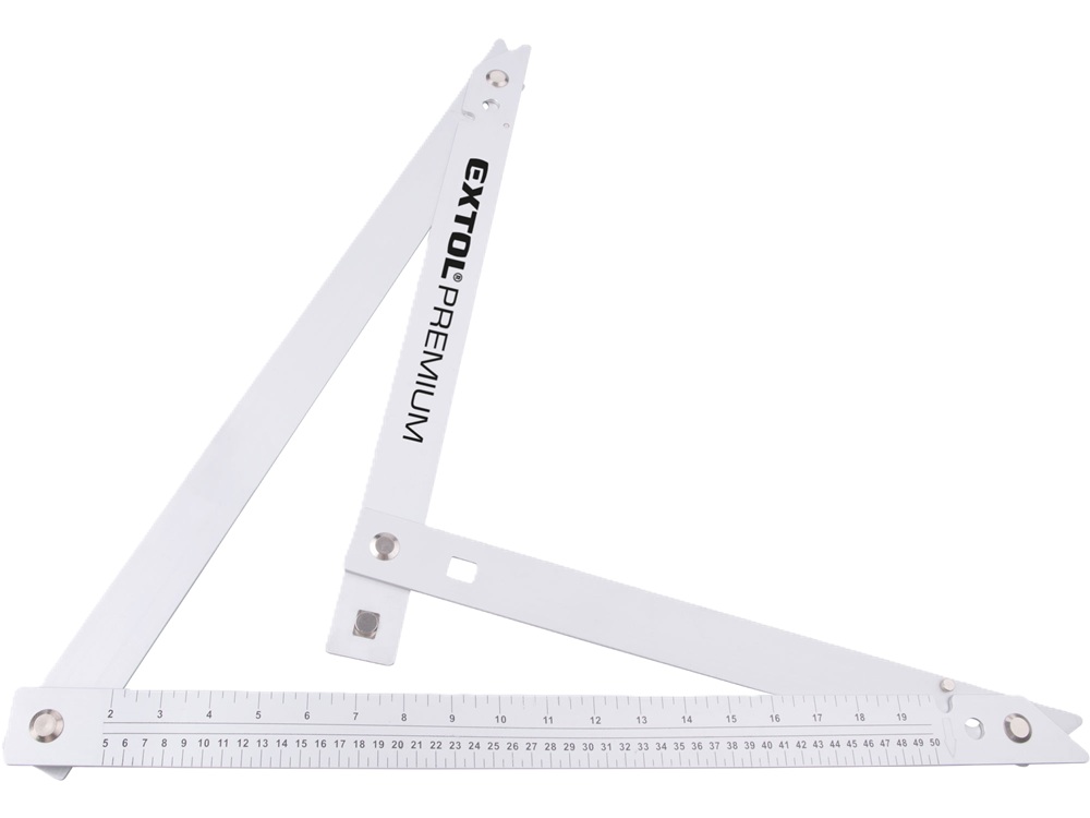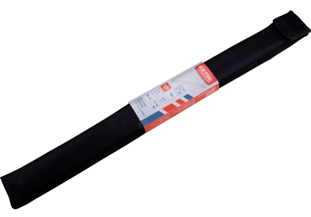 Lehká skládací kostrukce; v rozloženém stavu je úhelník pro zvýšení přesnosti vybaven fixačními prvky a výhodou je možnost úhelník po použití složit a uložit do nylonového pouzdra, které je součástí dodávky