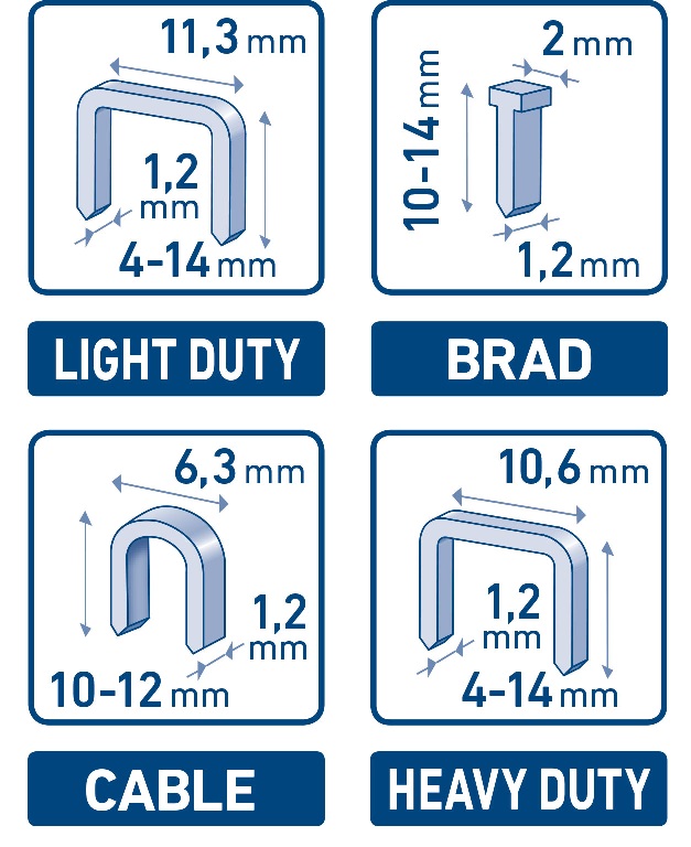 Oblé (kabelové) spony: výška 10-12 mm, šířka 6,2 mm.