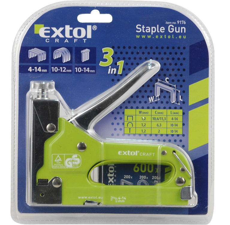 3funkční ruční sponkovací pistole určená pro použití s obdélníkovými i oblými sponami a hřebíky.