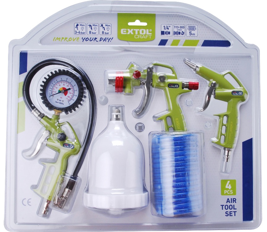 Sada obsahuje čtyři základní nástroje pro práci se stlačeným vzduchem:
