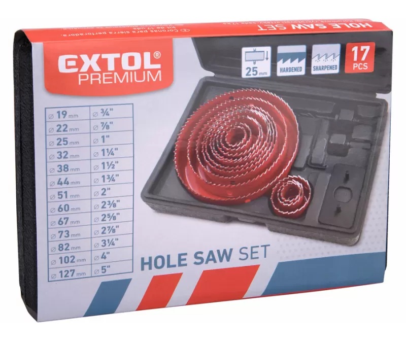 Průměry korunky jsou 19-22-25-32-38-44-51-60-67-73-82-102-127mm, výška korunky 25mm.