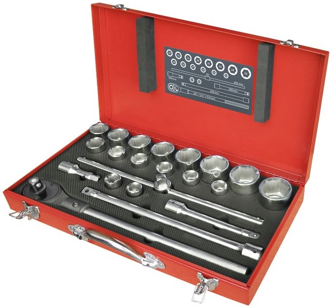 Sada obsahuje 22 ks nástavců a příslušenství z CrV oceli.