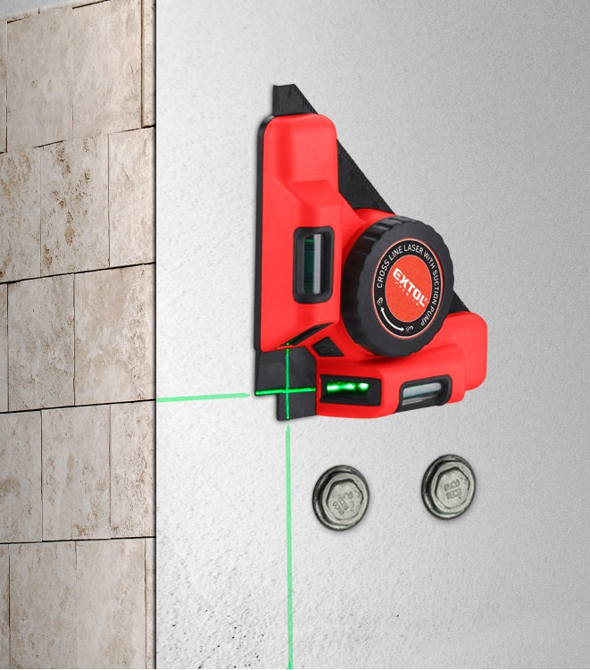 Laserový úhelník se zeleným paprskem určený pro rychlé a přesné pokládání dlažby nebo obkladů v úhlu 90°.