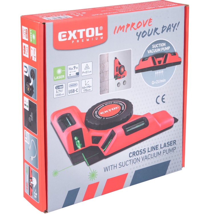 Laserový úhelník je vybaven elektrickým přísavným modulem se sacím výkonem cca 2l/min; plně nabitý přístroj v pracovním módu (s oběma zapnutými laserovými liniemi), se tak dokáže na neporézních materiálech udržet po dobu až 3hodin; bez zapnutého přísavného modulu dokáže plně nabitý přístroj (s oběma zapnutými liniemi) pracovat po dobu max. 7hodin.