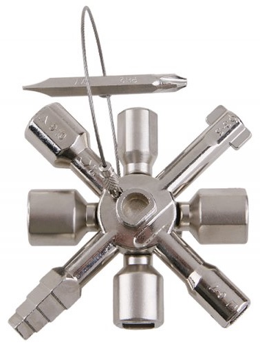 Univerzální klíč pro otevírání elektrických rozvaděčů, plynových a vodních kohoutů, pro klimatizaci, ventilaci a odvzdušňování topení.