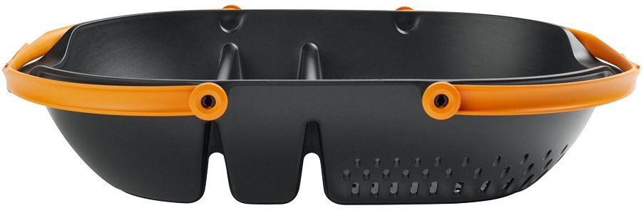 Část košíku s děrovaným dnem tvoří cedník vhodný pro praní sklizených výpěstků, část s plným dnem lze použít k namáčení nebo k přenášení už čistých výpěstků nebo nářadí.