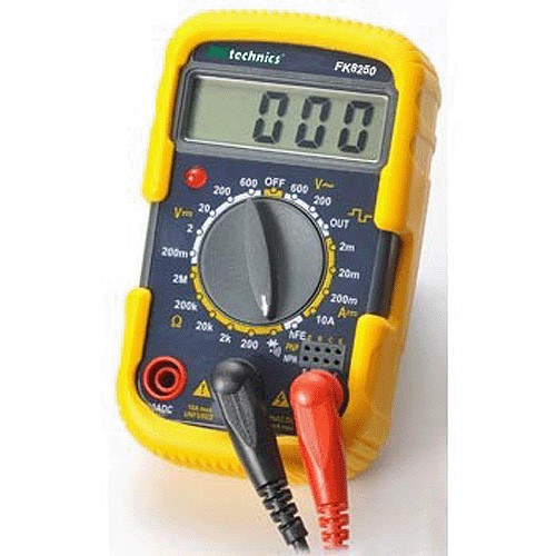 Značka: FK TECHNICS DC napětí: 600 V AC napětí: 600 V DC proud: 10 A Odpor: 2 MOhm Měření tranzistorů: hFE test Akustický test vodivosti Test diod Rozměry: 105 x 60 x 27 mm Napájení: baterie 9 V, typ 6F22 Hmotnost: 140g