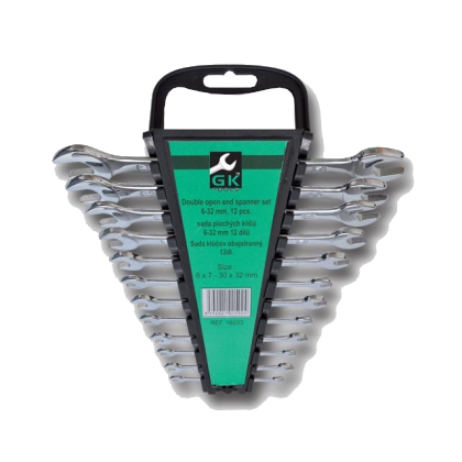 Sada plochých maticových klíčů v plastovém držáku.