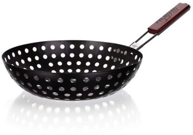 Pánev je opatřena otvory pro rovnoměrné grilování masa, ryb a zeleniny.