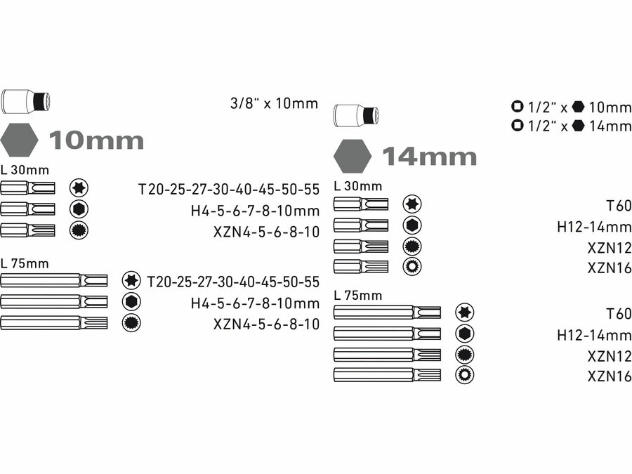 hlavice zástrčné: hroty zástrčné 10mm(L30mm):T20-25-27-30-40-45-50-55, H4-5-6-7-8-10mm, XZN4-5-6-8-10; 14mm(L30mm): T60, H12-14mm, XZN12, XZNTa16