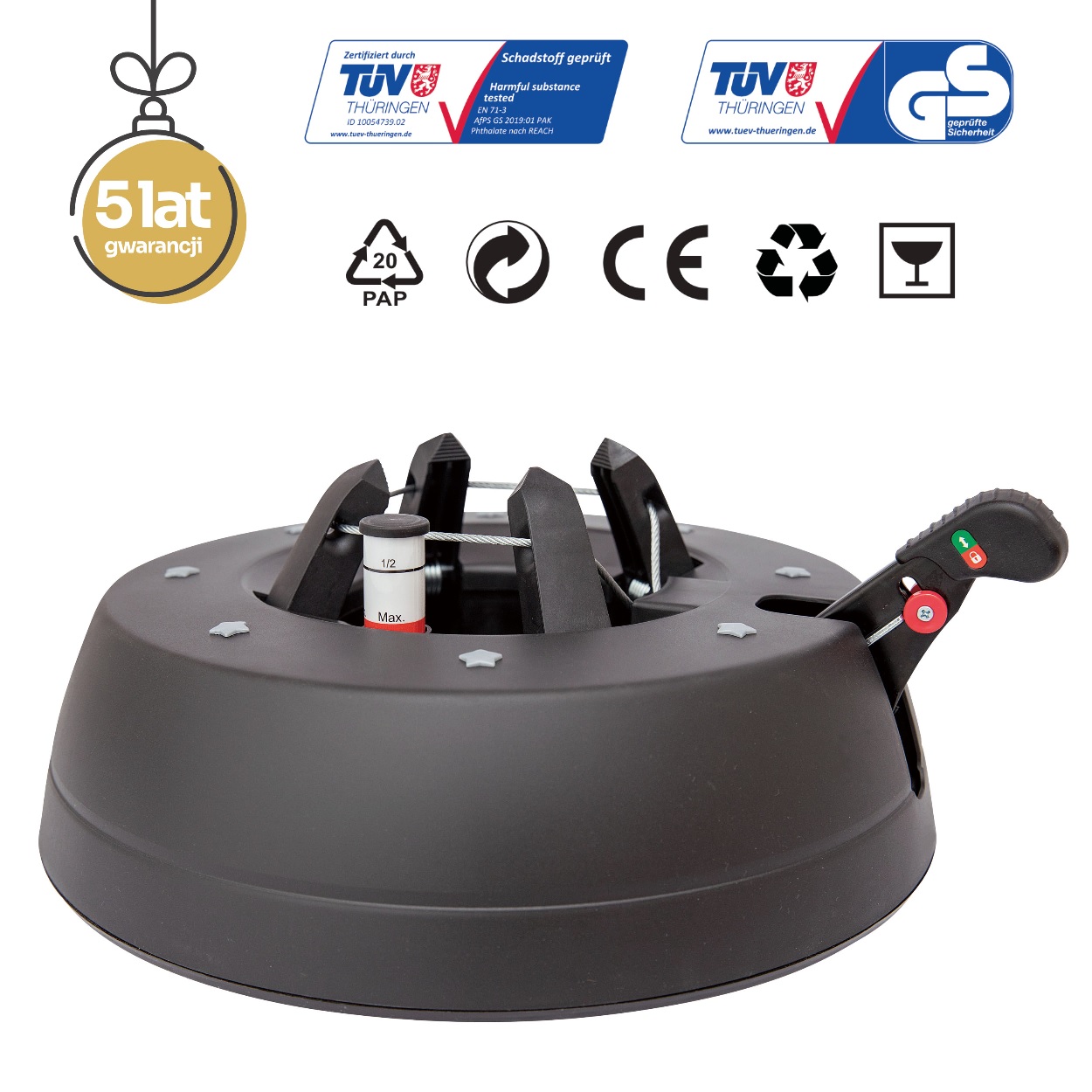 Patentovaný mechanismus 4 háčků, které upínají na kmen a fixují vánoční stromek.