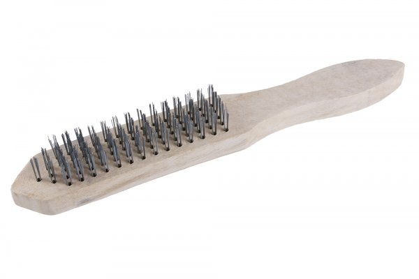 Ocelový kartáč - ruční, ocelový drát - pozinkovaný, dřevěvěné tělo, délka 300 mm, ergonomicky upravená rukojeť, 5 řad, počet drátů : 1200, použití: k číštění železných kovů jako je ocel, nerez, litina, zdrsnění, a hrubé odstranění starých nátěrů.