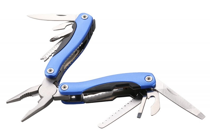 Multifunkční kapesní nástroj 9 funkcí: kleště, nůž - čepel 55 mm, pilka - ostří 55 mm, pilník, šroubováky PH1 a plochý 4 a 2 mm, otvírák na konzervy, otvírák na lahve, nástroj pro rybáře s měřítkem 5 cm/2"