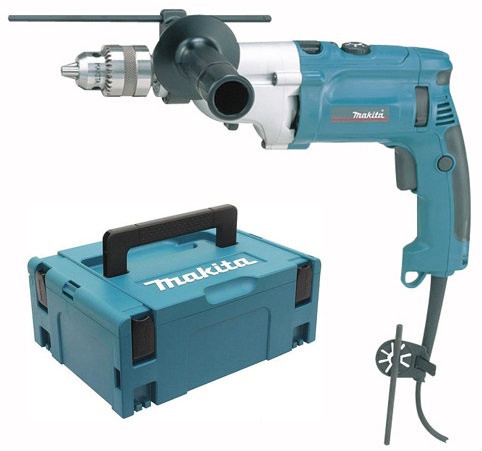 Dvourychlostní příklepová vrtačka Makita HP2070J s výkonem 1010 W a hmotností 2,5 kg.