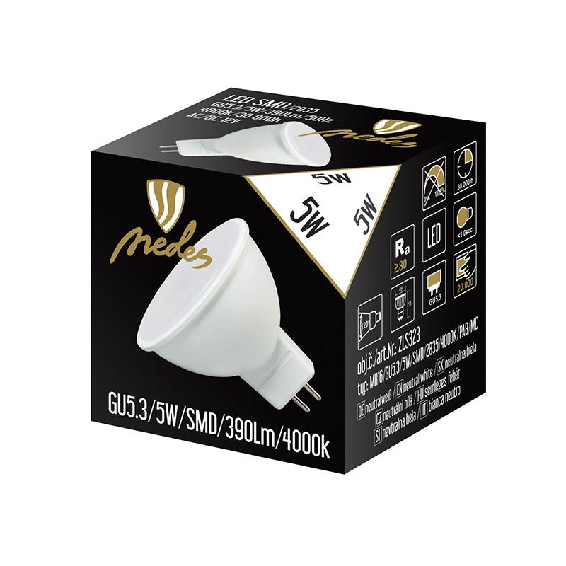 Spotřeba: 5W světelný tok: 390Lm patice: GU5,3/MR16 chromatičnost (barva světla): 4000K - neutrální bílá úhel světla: 120° rozměr (mm): pr. 49 x 51 napětí: AC/DC12V životnost: 30 000h spínací cyklus: 20 000 x energetická třída: A+ náhrada za cca: 50W stmívatelná: ne materiál: thermal PC + Al"