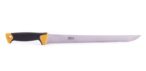 Nůž na polystyren a minerální vatu s plastovou rukojetí a jednostranným ostřím. Na řezání polystyrenu a minerální vaty.