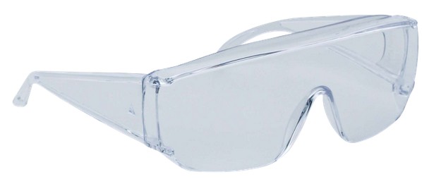 Uzavřené čiré ochranné brýle s ochrannými bočnicemi, ideální pro krátkodobé použití.