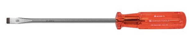 Kované čepele, břity jsou přesně přizpůsobené normovaným drážkám v hlavách šroubů. Rukojeť z transparentního nárazuvzdorného plastu. Čepel ze speciální slitiny PB Swiss Tools s nejvyšší možnou tvrdostí při zvláštní houževnatosti. S rovnoběžně plochým, odsazeným břitem. Povrch chromovaný, břity černé.