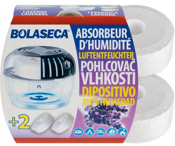 Pohlcovač vlhkosti + 2 tablety s vůní levandule, pohlcující vlhkost a neutralizující nepříjemné pachy v místnosti. Absorbuje vlhkost ze vzduchu a vodu hromadí v zásobníku. Chrání před vznikem plísní, zamlžováním oken a přispívá ke zdravému prostředí v domácnosti. Pohlcovač vlhkosti nepotřebuje k provozu elektřinu a nevydává žádný zvuk.