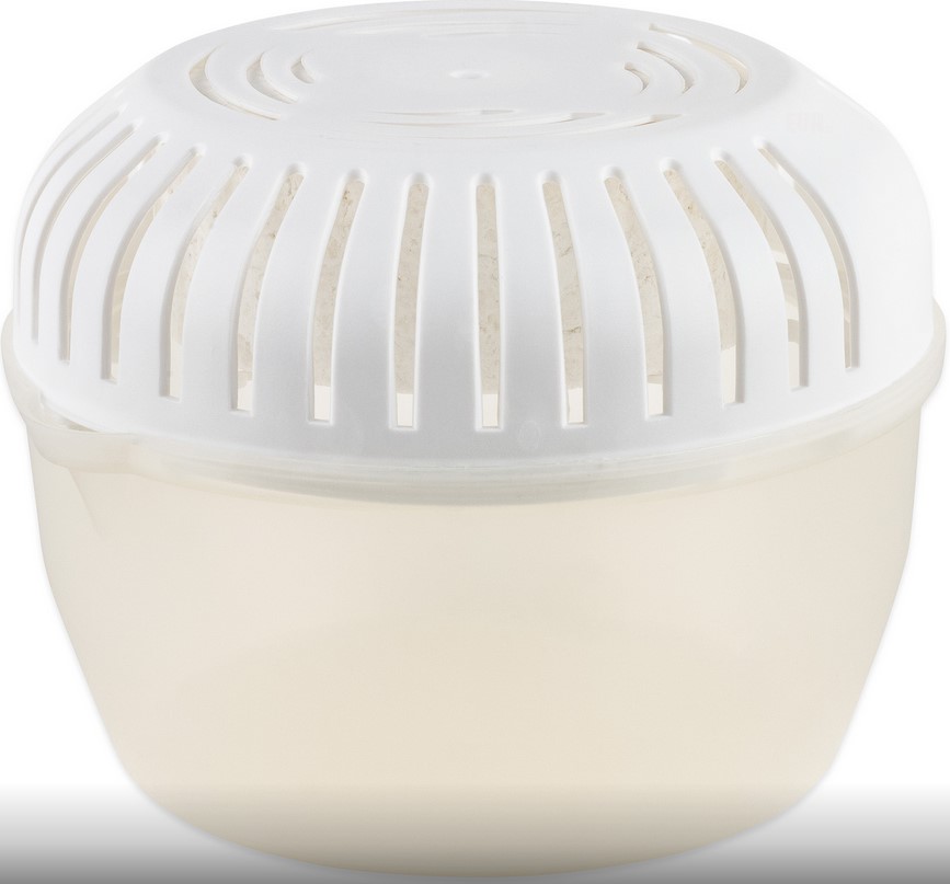 Univerzální využití ve sklepech, garážích, koupelnách, v místnostech, které nejsou pravidelně větrány. Balení obsahuje nádobu s bílým víkem a středovým sítkem a 2 tablety Bolaseca 450 g se svěží vůní levandule. Rozměry nádoby: průměr 15,5 x 12 cm. Barva bílá. Vyrobeno ve Španělsku.