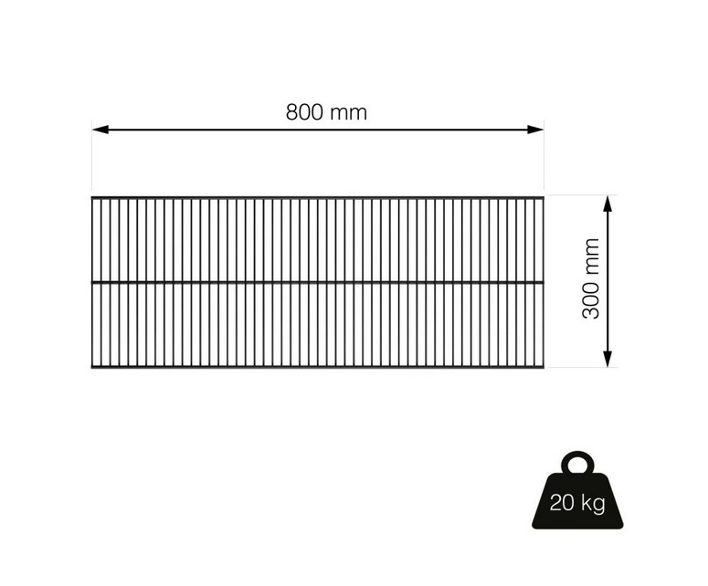 Kovová drátěná police v matné černé barvě o šířce 800 mm a hloubce 300 mm s nosností do 20 kg. Součástí balení 1 ks.