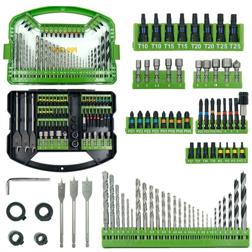 Kompletní výbava pro vrtání i šroubování. Obsahuje vrtáky do kovu (HSS), zdiva, dřeva i ploché vrtáky