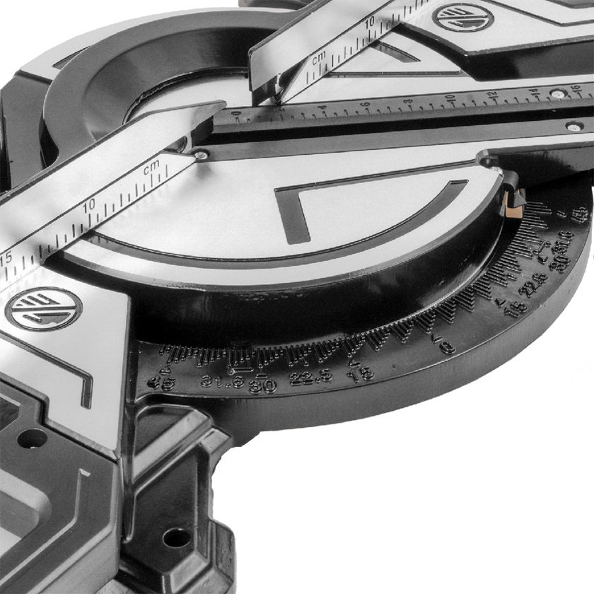 Výsuvné boční stolky s dorazem pro stabilní podpora delších obrobků při řezání.
