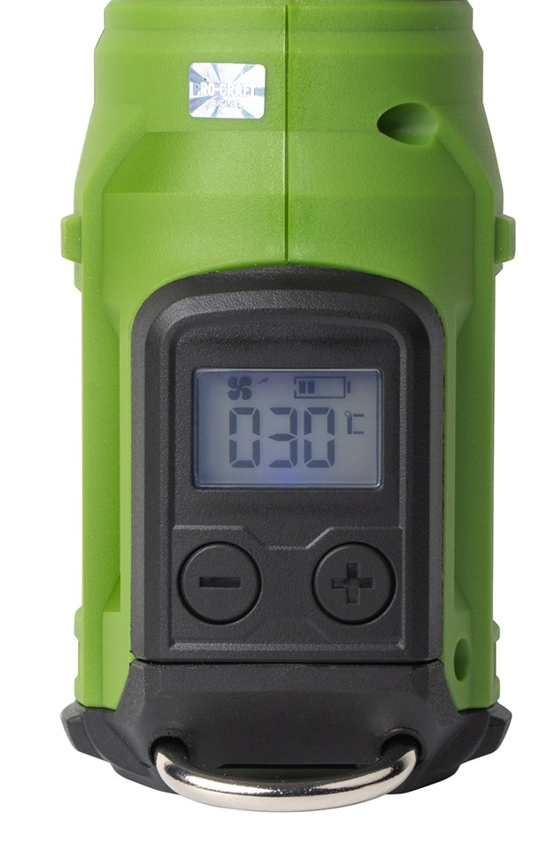 Pistole má digitální displej kde vidíte nastavení průtoku vzduchu a teploty.