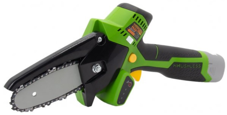 Snadná výměna řetězu, pružný ochranný kryt pro bezpečnou práci, ukazatel stavu nabití.