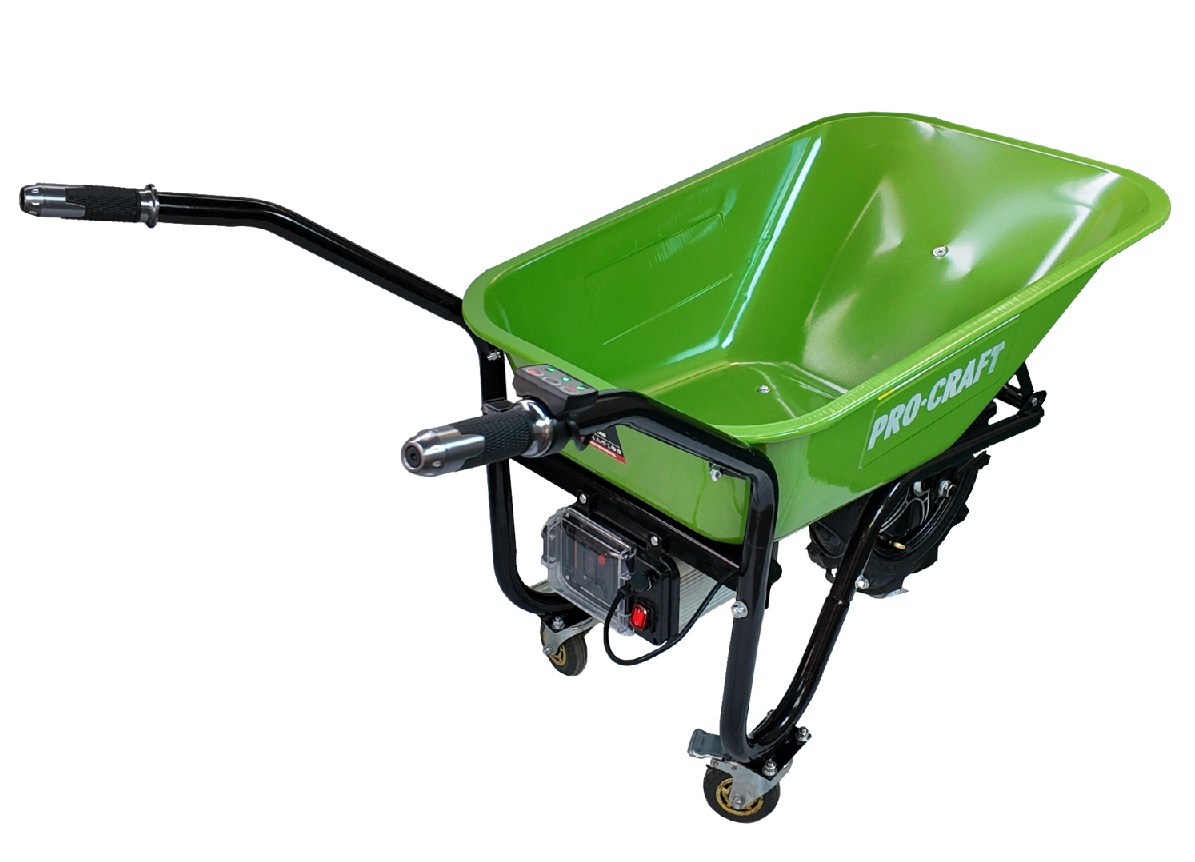 Přední nafukovací kolo o průměru 420 mm zajišťuje vynikající manipulaci i na nerovném povrchu. Aku kolečko má promyšlený design a pohodlné pogumované rukojeti.