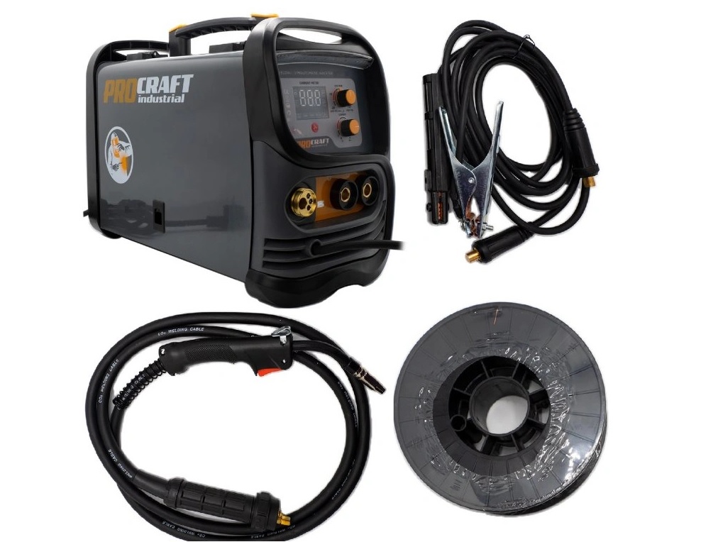 Součástí balení je svařovací drát o průměru 0,8 mm v 5kg cívce (D200), MIG hořák s eurokoncovkou, svářečský štít, kabel s držákem elektrody, zemnící kabel s kleštěmi a kombinovaný drátěný kartáč s kladivem na odstraňování strusky.