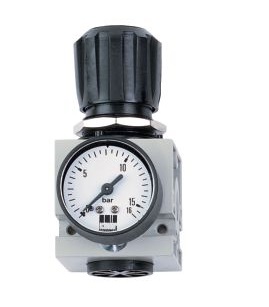 Nastavovací knoflík s aretací. Regulační rozsah 0-12 bar. Sériově s manometrem.